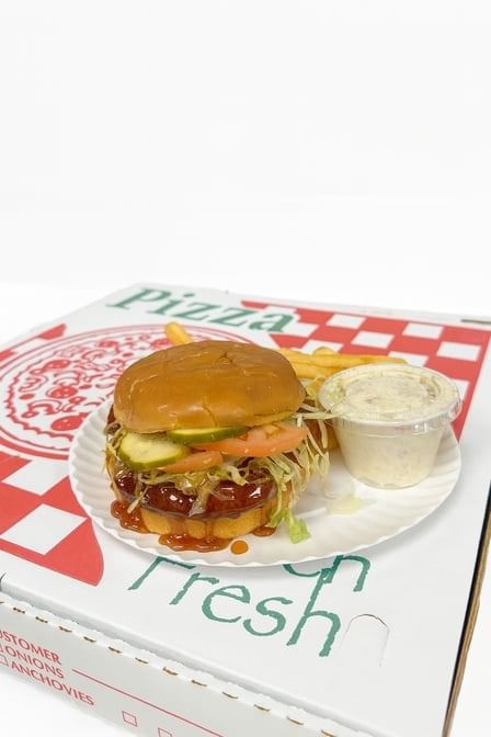 Fried to perfection chicken, topped with Crispy Beef Bacon, lettuce, tomatoes, and pickles. Also comes with a side of Fries and Coleslaw