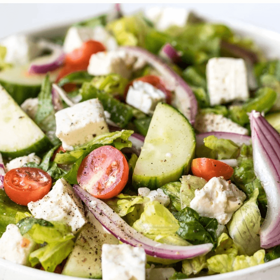 Romaine lettuce, tomato, green pepper, fresh onion, olives, cucumber, feta cheese, and egg