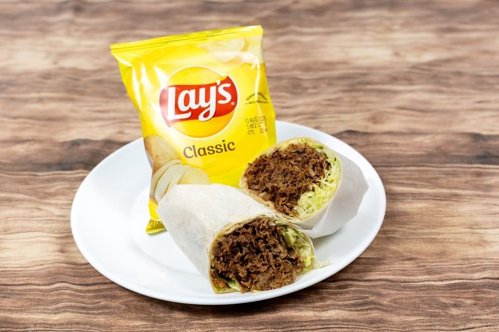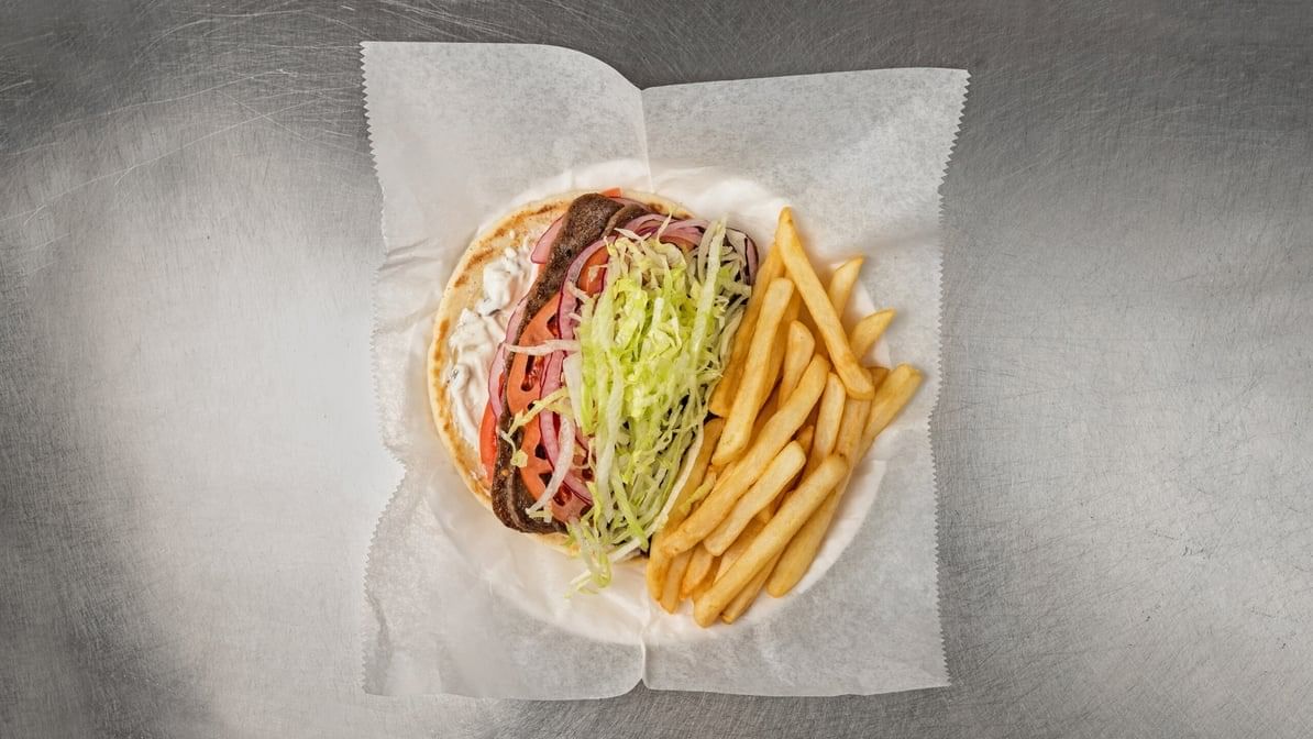 a gyro topped with lettuce, tomatoes, onions, and tzatziki sauce served on a pita bread with your choice of meat with fries, salad and coleslaw.