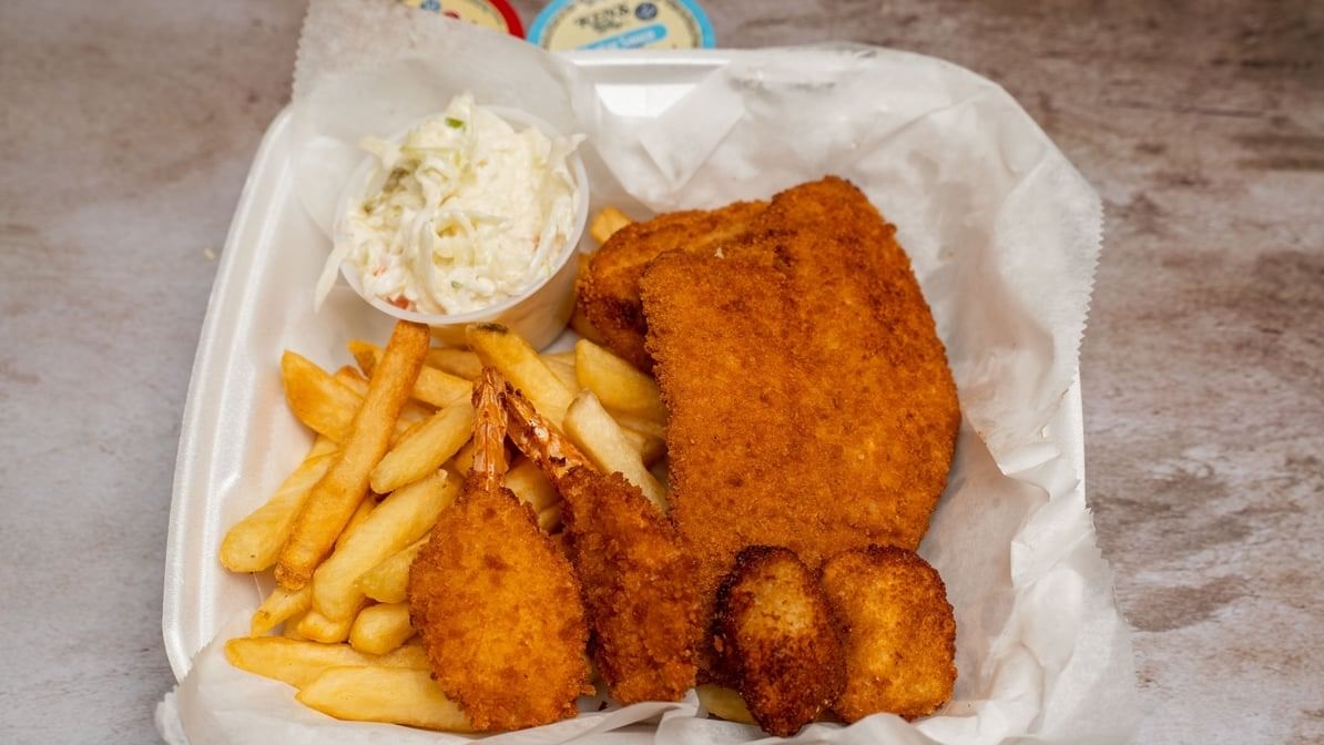 Comes with 4 shrimp, 1 flounder served with fries, coleslaw, and a side salad