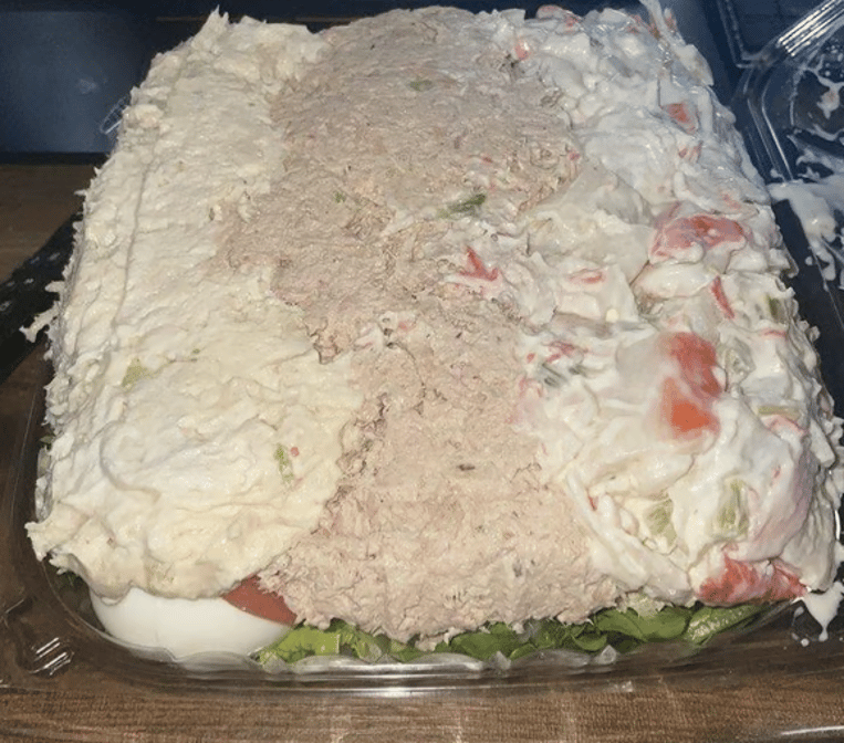 Romaine lettuce, tomato, fresh onion, green pepper, cucumber, a scoop of tuna, chicken salad and seafood salad