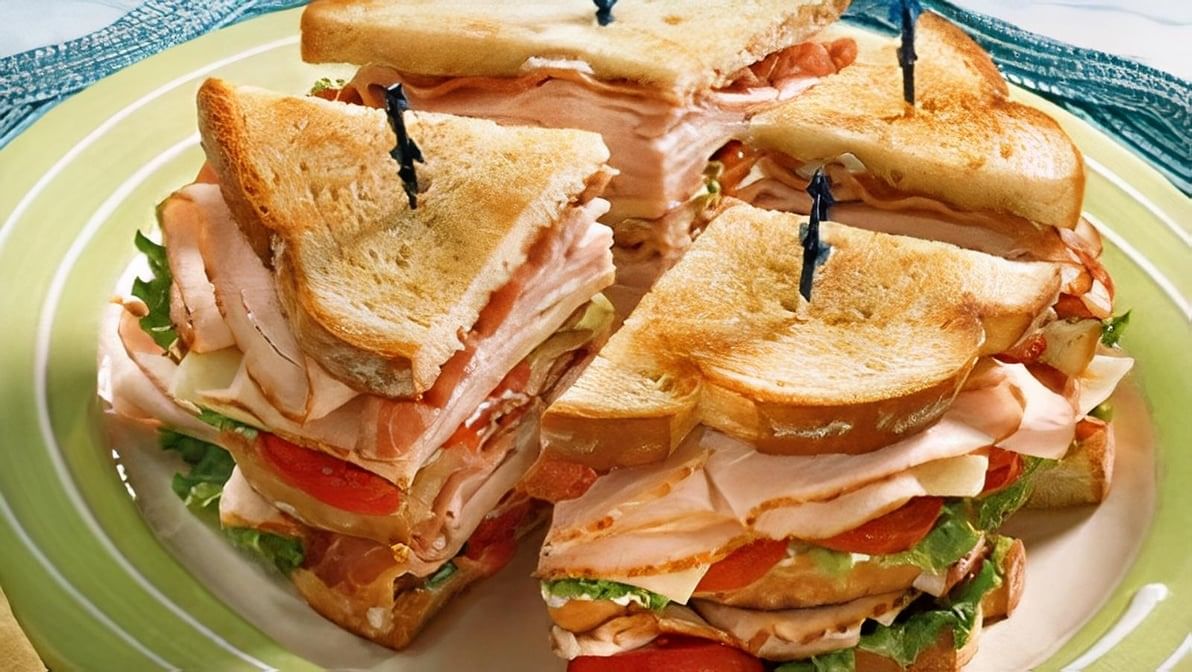 Tender turkey slices layered with melted cheese, crisp lettuce, and creamy mayonnaise between two slices of toasted bread