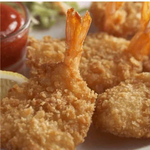 21 pieces of fried to a golden brown shrimp. Served with fries coleslaw and salad.
