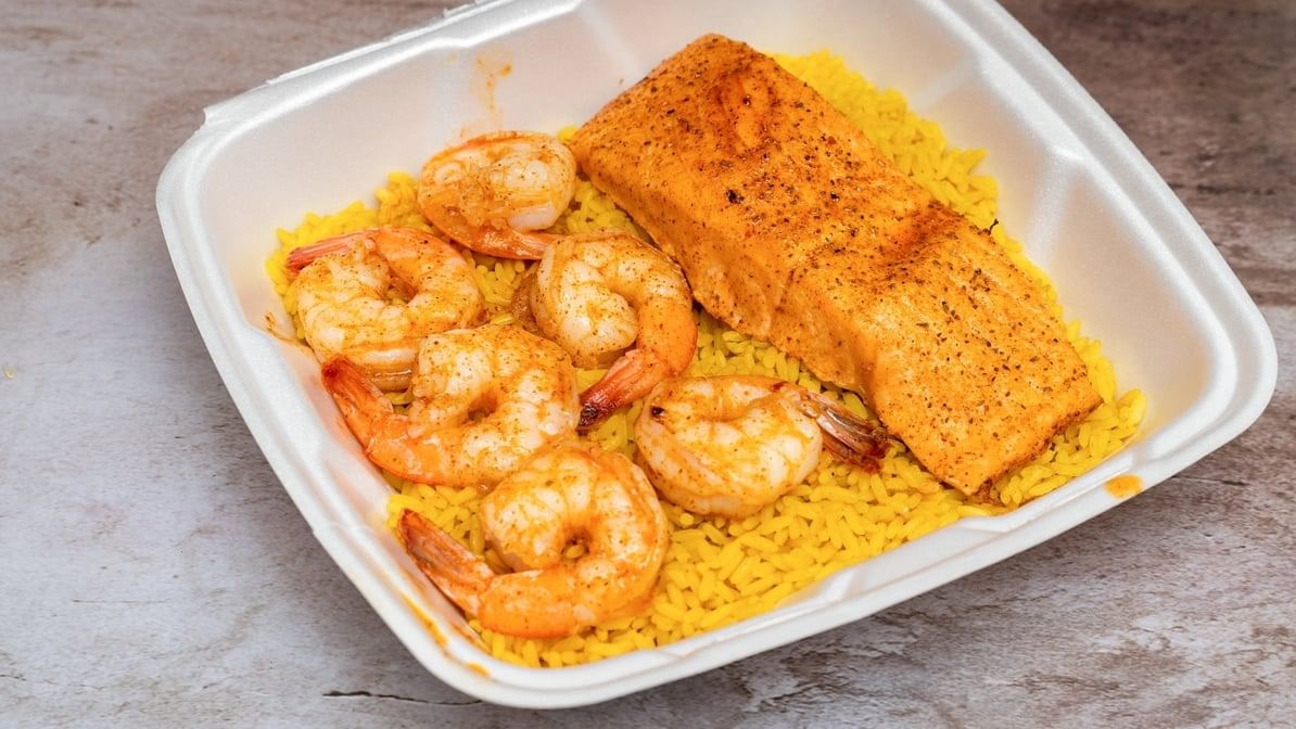 Salmon & shrimp paired with choice of yellow rice or fries. Select from over 9 dressings including honey mustard, balsamic and more