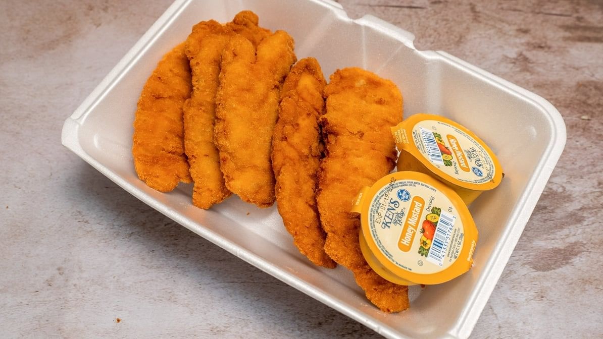 Chicken tenders available in 5, 10, or 15 pieces. Choice of sauce: honey mustard, barbecue, hot sauce, blue cheese, or ranch