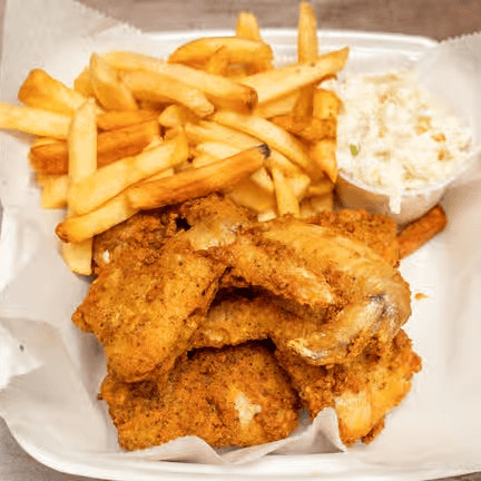 Three chicken fingers, four chicken nuggets and two chicken wings. Served with French fries, coleslaw and salad.