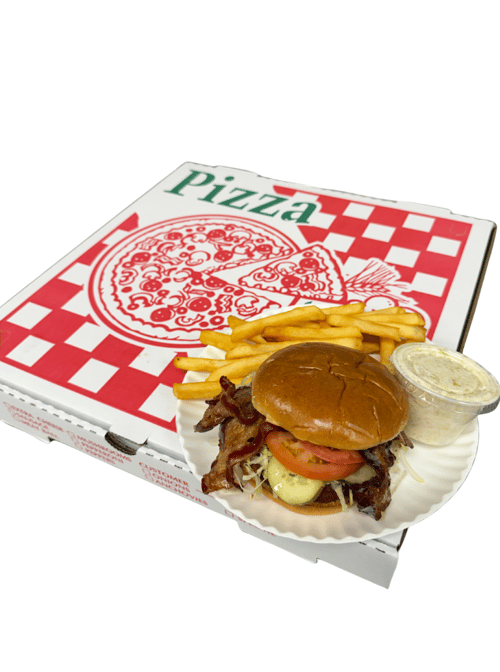 Our 80/20 beef patties served on a brioche bun, topped with beef bacon, mushroom, tomato, onion, mayo, salt, pepper, and ketchup.
