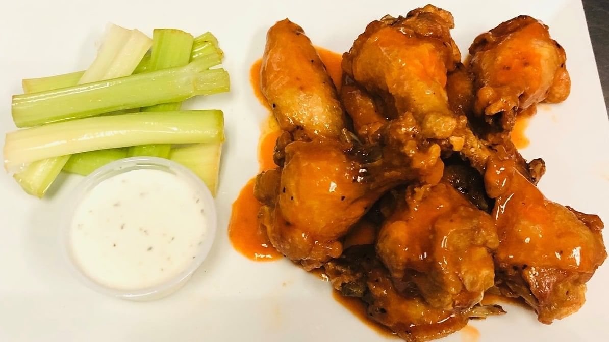 Buffalo wings in mild, hot, or BBQ flavors, served with celery and dipping sauce. Includes a choice of 2-liter soda: Pepsi, Diet Pepsi, Mountain Dew, Ginger Ale, Sunkist Orange, Hawaiian Punch, 7 Up