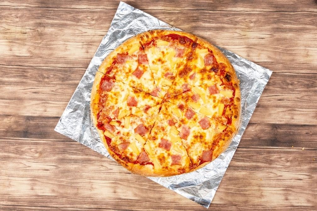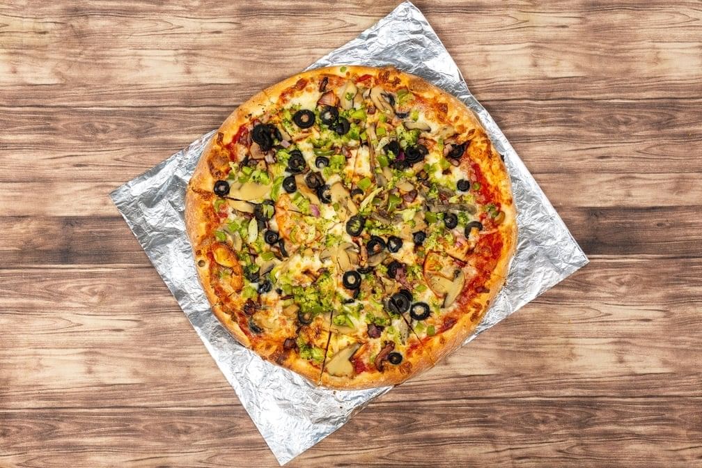 Ten toppings including sausage, pepperoni, bacon, turkey ham, salami, tomatoes, green peppers, onion, black olives and mushrooms