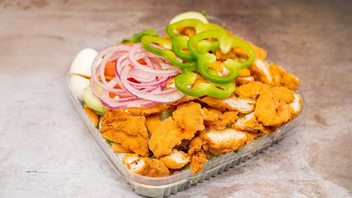 Romaine lettuce, tomato, fresh onion, green pepper, cucumber, egg and fried chicken fingers