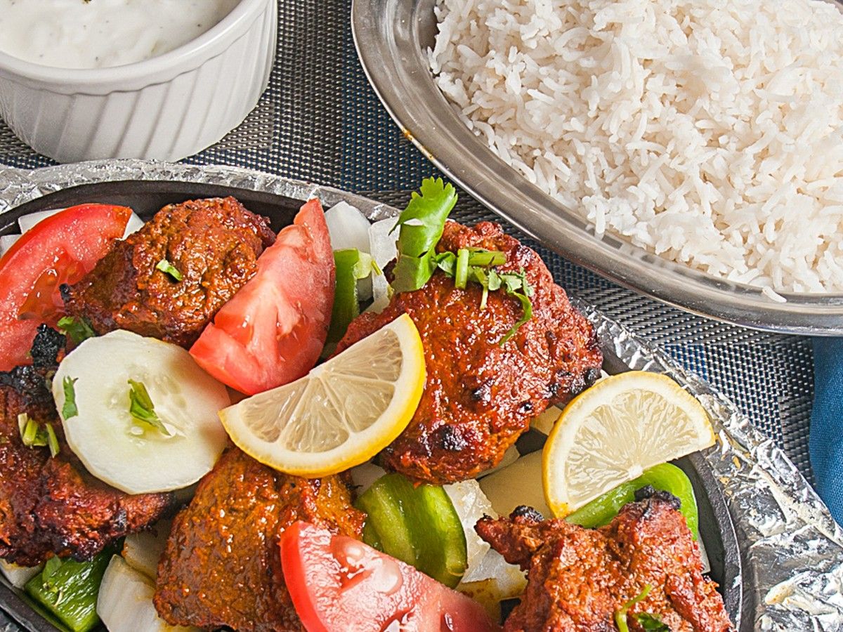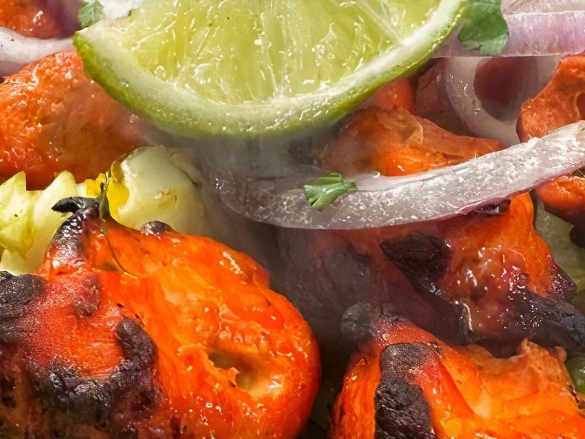 Pieces of lamb marinated with fresh homemade yogurt and spices perfectly grilled in the tandoor clay oven sizzling hot.