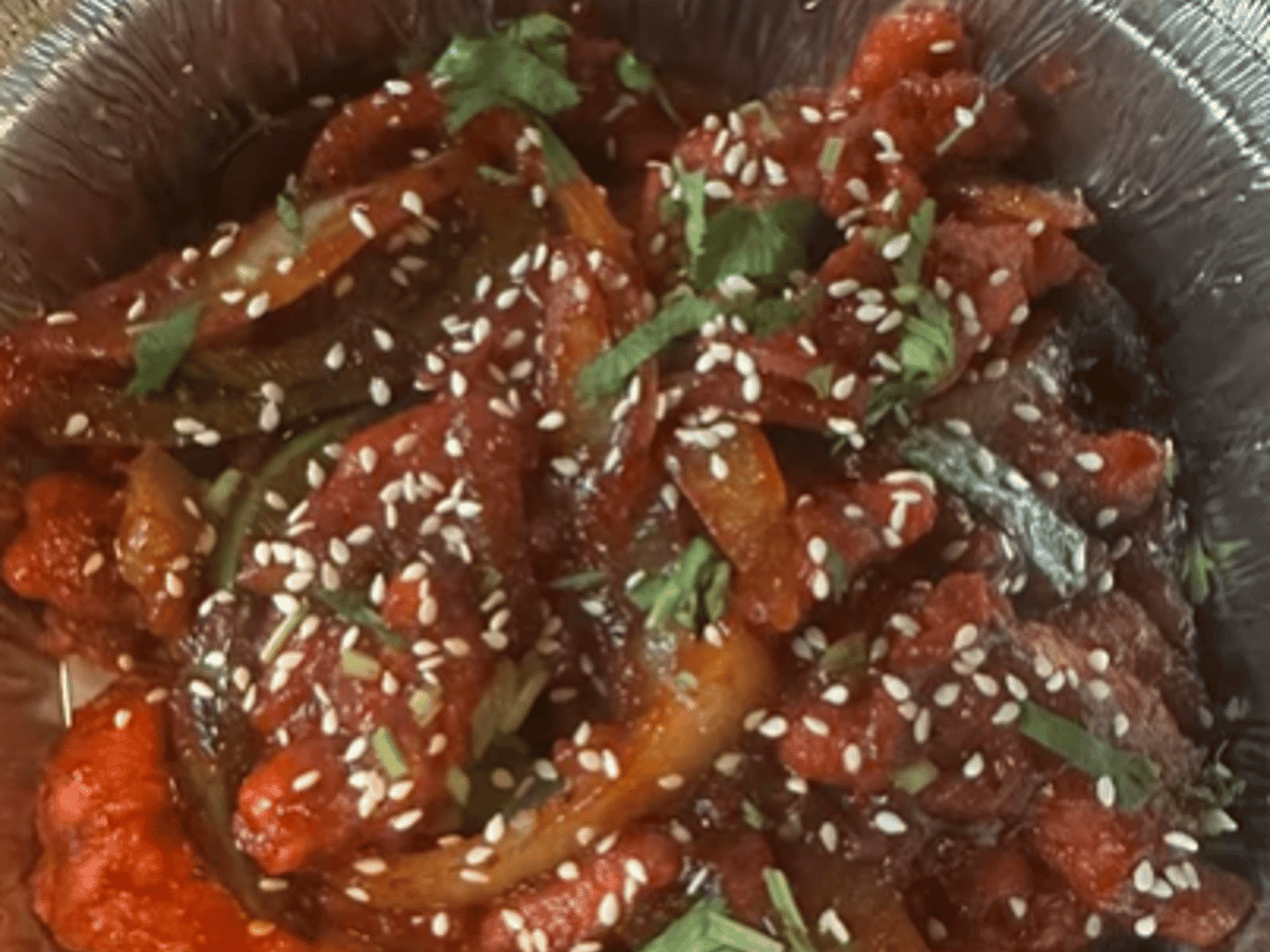 Chicken thigh cooked with Chinese batter with Chinese hot sauces, onion and peppers