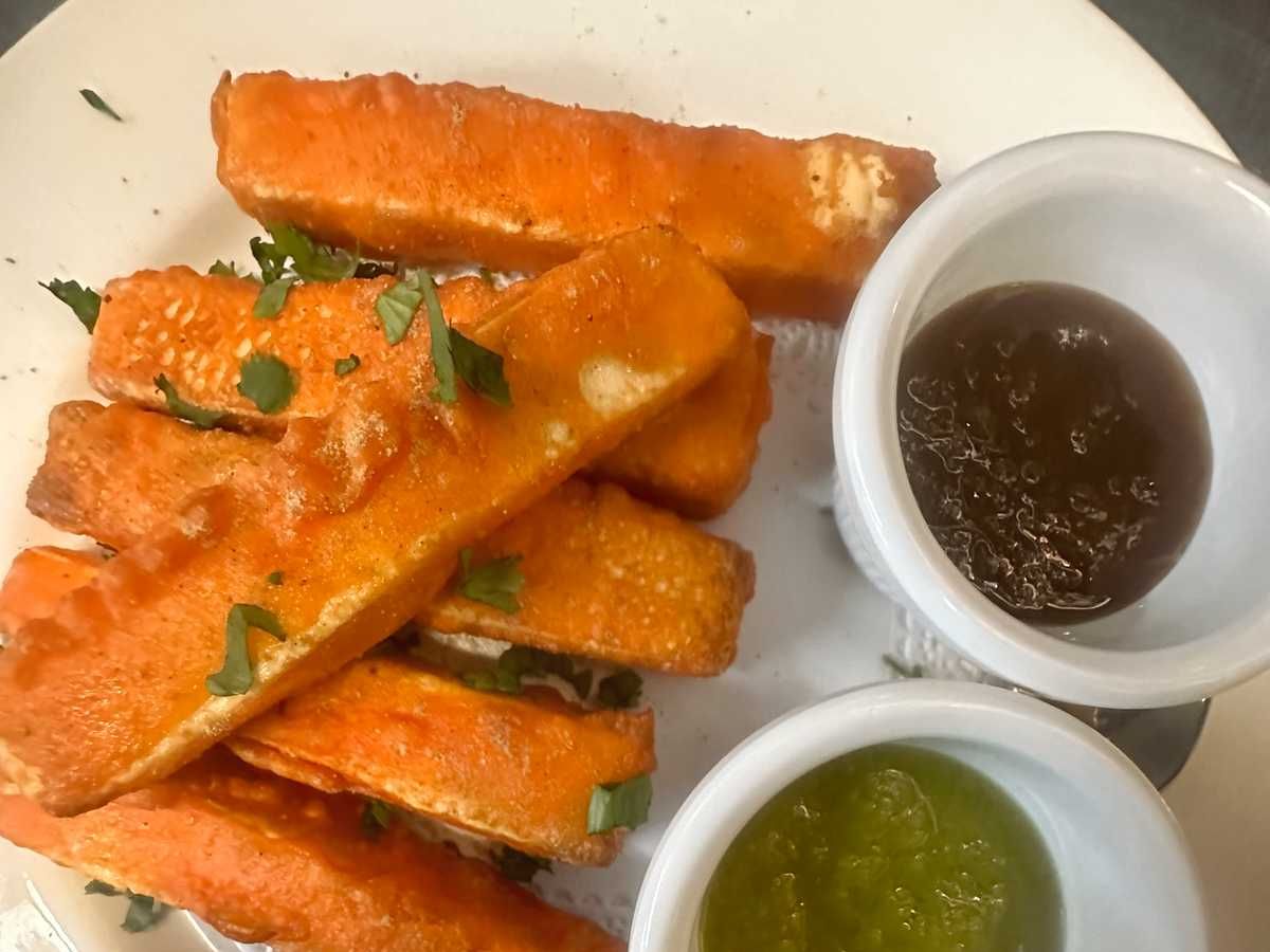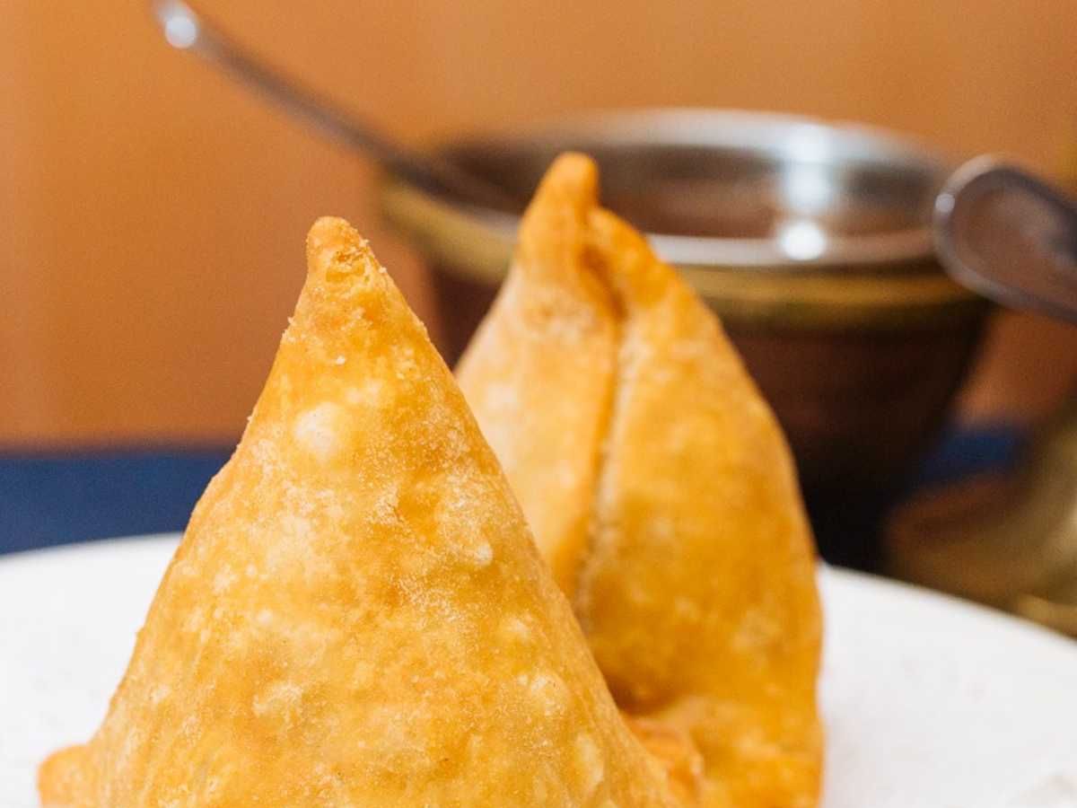 Crispy pastry turnover filled with ground chicken or vegetables.