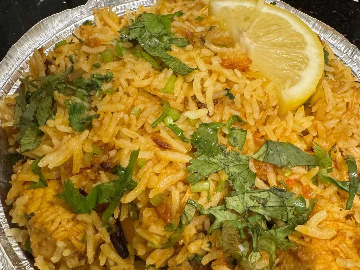 Basmati rice cooked with chicken, mixed with onions, fresh ginger, cashew nuts and golden raisins, flavored with saffron and delicate spices.