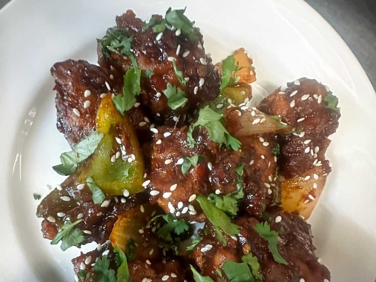 Paneer (Indian cottage cheese) is tossed in a flavorful aromatic spiced made with soy sauce and chili sauce.