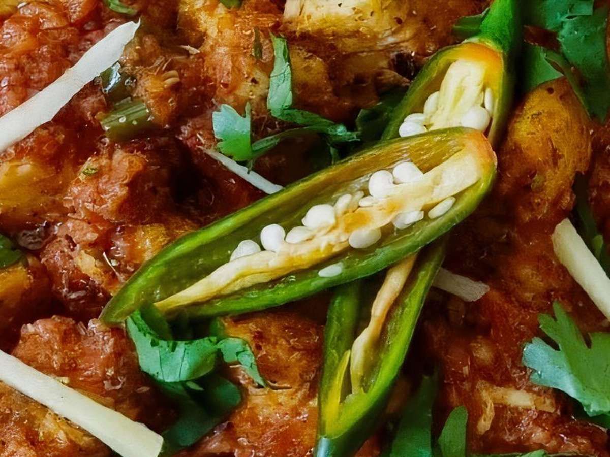 Chicken cooked with onion, garlic, tomatoes and fresh chili peppers, flavored with pickled spices.