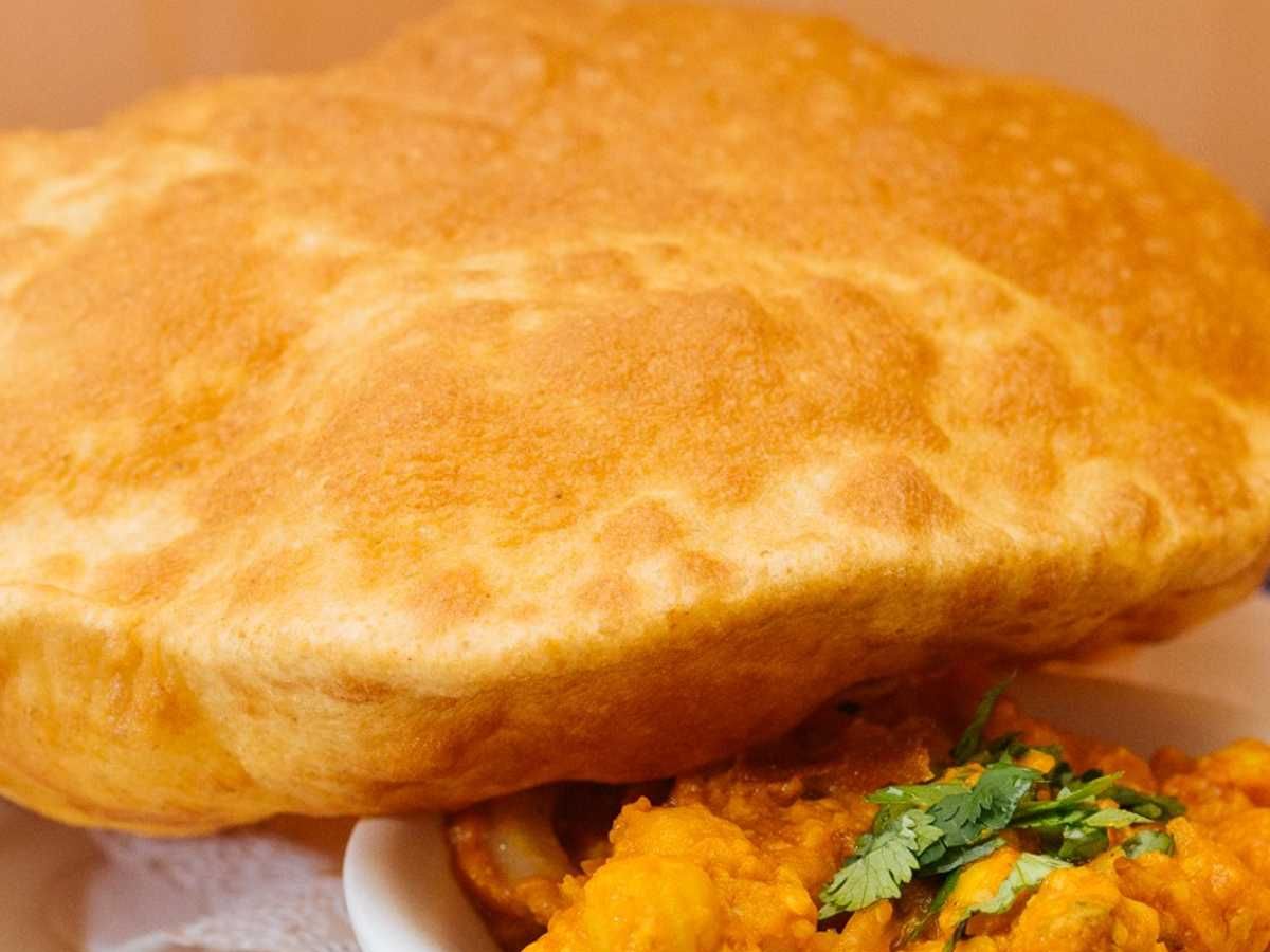 Stir fried chick peas masala served with deep fried light fluffy bread.